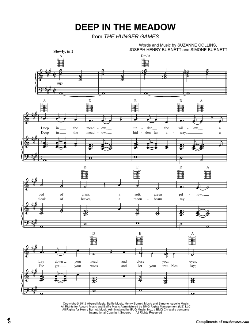 1. Deep In the Meadow (Lullaby) (click here to preview and play this piece) Performer: Composers: Lyricists: Scored For:Piano/Vocal/Guitar Instruments:Voice, range: C#4-C#5, Piano and Guitar Number of pages:3 Click here to purchase this piece separately for $5.99 |