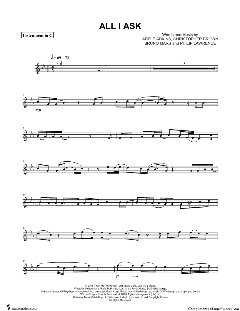 1. All I Ask - C Instrument (click here to preview and play this piece) Performer: Composers: Lyricists: Scored For:Instrumental Part and Instrumental Solo Instruments:C Instrument, range: Eb4-C#6, Violin, Oboe, Flute and Recorder Number of pages:3 Click here to purchase this piece separately for $4.99 |