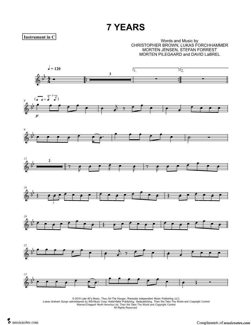 1. 7 Years - C Instrument (click here to preview and play this piece) Performer: Composers: Lyricists: Scored For:Instrumental Part and Instrumental Solo Instruments:C Instrument, range: G4-Bb5, Flute, Violin, Oboe and Recorder Number of pages:3 Click here to purchase this piece separately for $4.99 |