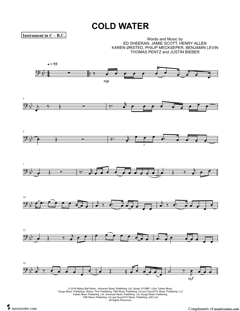 1. Cold Water - Bass Clef Instrument (click here to preview and play this piece) Performers: Composers: Lyricists: Scored For:Instrumental Part and Instrumental Solo Instruments:Bass Clef Instrument, range: F2-A3, Trombone, Baritone Horn, Bassoon, Double Bass and Cello Number of pages:2 Click here to purchase this piece separately for $4.99 |