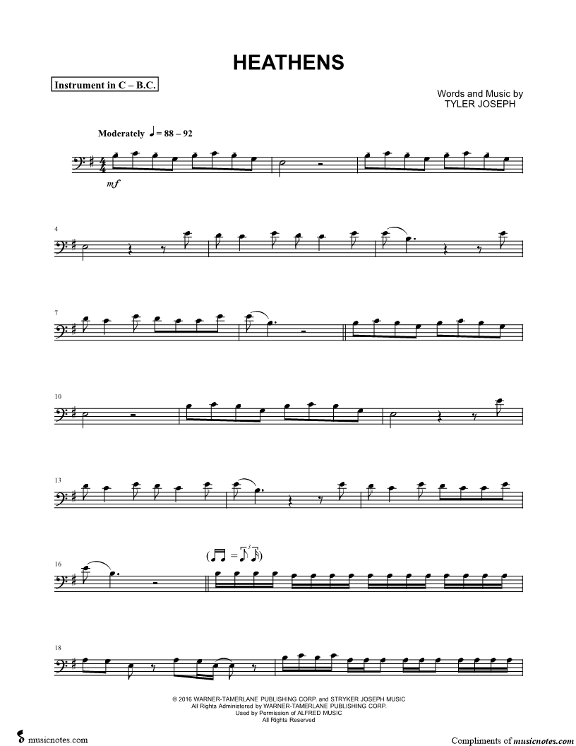 1. Heathens - Bass Clef Instrument (click here to preview and play this piece) Performer: Composer: Lyricist: Scored For:Instrumental Part and Instrumental Solo Instruments:Bass Clef Instrument, range: E3-G4, Trombone, Bassoon, Baritone Horn or Euphonium, Cello and Double Bass Number of pages:3 Click here to purchase this piece separately for $4.99 |