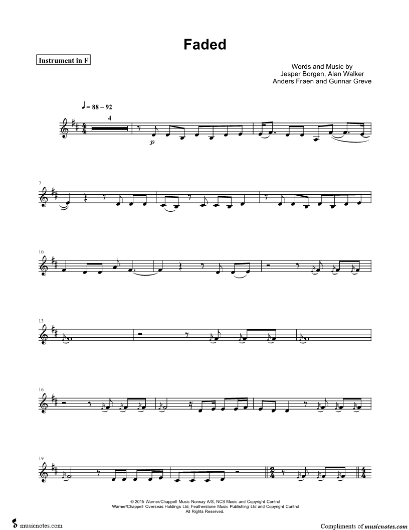 1. Faded - F Instrument (click here to preview and play this piece) Performer: Composers: Lyricists: Scored For:Instrumental Part and Instrumental Solo Instruments:F Instrument, range: A3-B4 and French Horn Number of pages:3 Click here to purchase this piece separately for $4.99 |