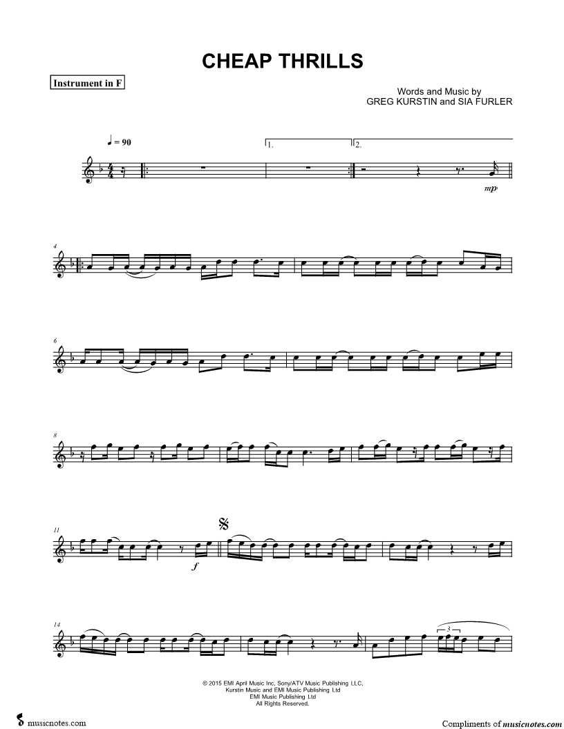 1. Cheap Thrills - F Instrument (click here to preview and play this piece) Performer: Composers: Lyricists: Scored For:Instrumental Solo and Instrumental Part Instruments:F Instrument, range: G4-G5 and French Horn Number of pages:2 Click here to purchase this piece separately for $4.99 |