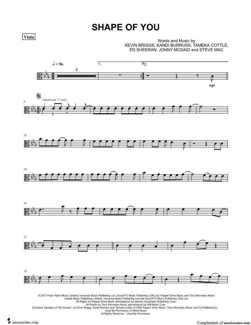 1. Shape of You - Viola (click here to preview and play this piece) Performer: Composers: Lyricists: Scored For:Instrumental Solo and Instrumental Part Instrument:Viola, range: G3-Bb4 Number of pages:3 Click here to purchase this piece separately for $4.99 |