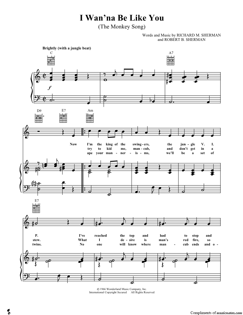 1. I Wan'na Be Like You (click here to preview and play this piece) Performers: Composers: Lyricists: Scored For:Piano/Vocal/Guitar Instruments:Voice, range: E4-E5, Piano and Guitar Number of pages:4 Click here to purchase this piece separately for $5.99 |