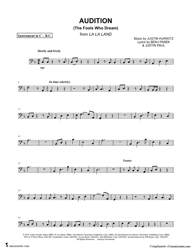 1. Audition (The Fools Who Dream) - Bass Clef Instrument (click here to preview and play this piece) Performer: Composer: Lyricists: Scored For:Instrumental Part and Instrumental Solo Instruments:Bass Clef Instrument, range: G2-B3, Trombone, Bassoon, Baritone Horn or Euphonium, Cello and Double Bass Number of pages:2 Click here to purchase this piece separately for $4.99 |