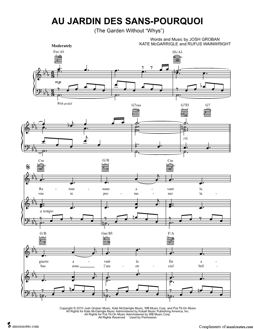 1. Au Jardin Des Sans-Pourquoi (click here to preview and play this piece) Performer: Composers: Lyricists: Scored For:Piano/Vocal/Guitar Instruments:Voice, range: C4-F5, Piano and Guitar Number of pages:5 Click here to purchase this piece separately for $5.99 |
