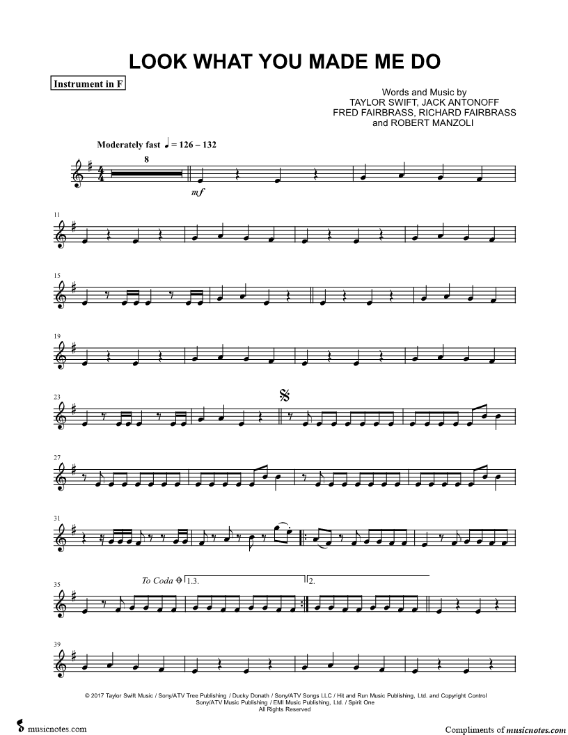 1. Look What You Made Me Do - F Instrument (click here to preview and play this piece) Performer: Composers: Lyricists: Scored For:Instrumental Solo and Instrumental Part Instruments:F Instrument, range: D#4-G5 and French Horn Number of pages:2 Click here to purchase this piece separately for $4.99 |
