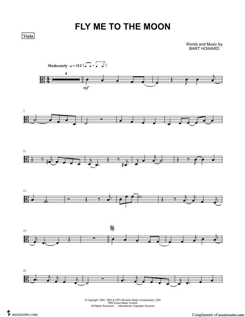 1. Fly Me to the Moon - Viola (click here to preview and play this piece) Performer: Composer: Lyricist: Scored For:Instrumental Solo and Instrumental Part Instrument:Viola, range: C3-A4 Number of pages:2 Click here to purchase this piece separately for $4.99 |