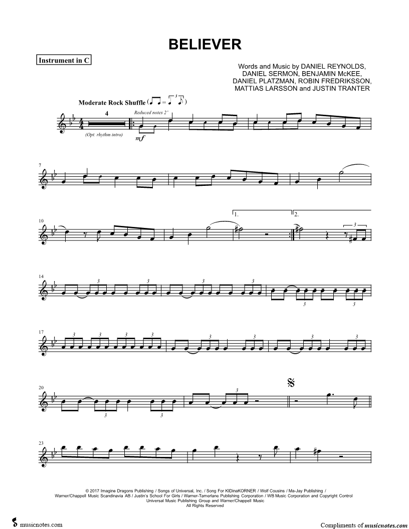 1. Believer - C Instrument (click here to preview and play this piece) Performer: Composers: Lyricists: Scored For:Instrumental Part and Instrumental Solo Instruments:C Instrument, range: F4-Bb5, Flute, Violin, Oboe and Recorder Number of pages:3 Click here to purchase this piece separately for $4.99 |