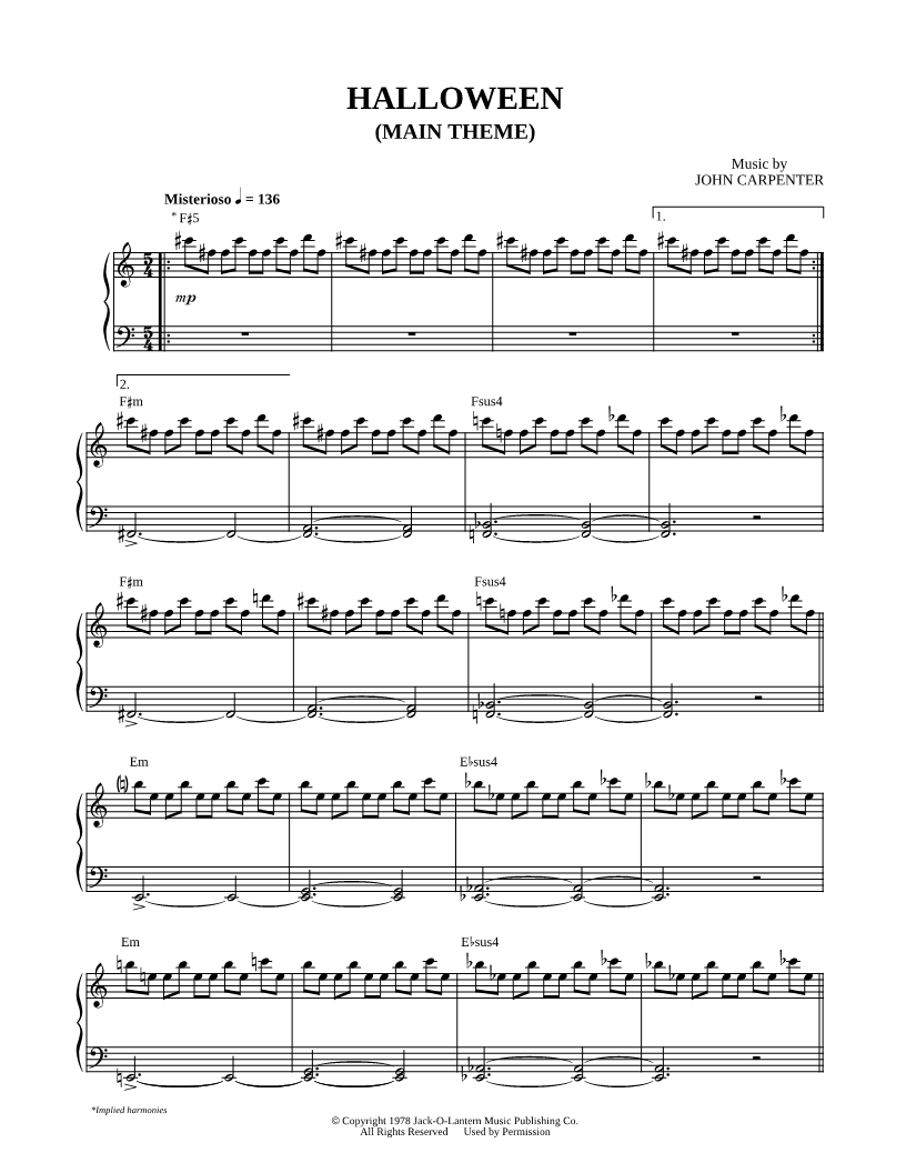 1. Halloween (Main Theme) (click here to preview and play this piece) Performer: Composer: Scored For:Instrumental Solo Instrument:Piano Number of pages:3 Click here to purchase this piece separately for $5.99 |