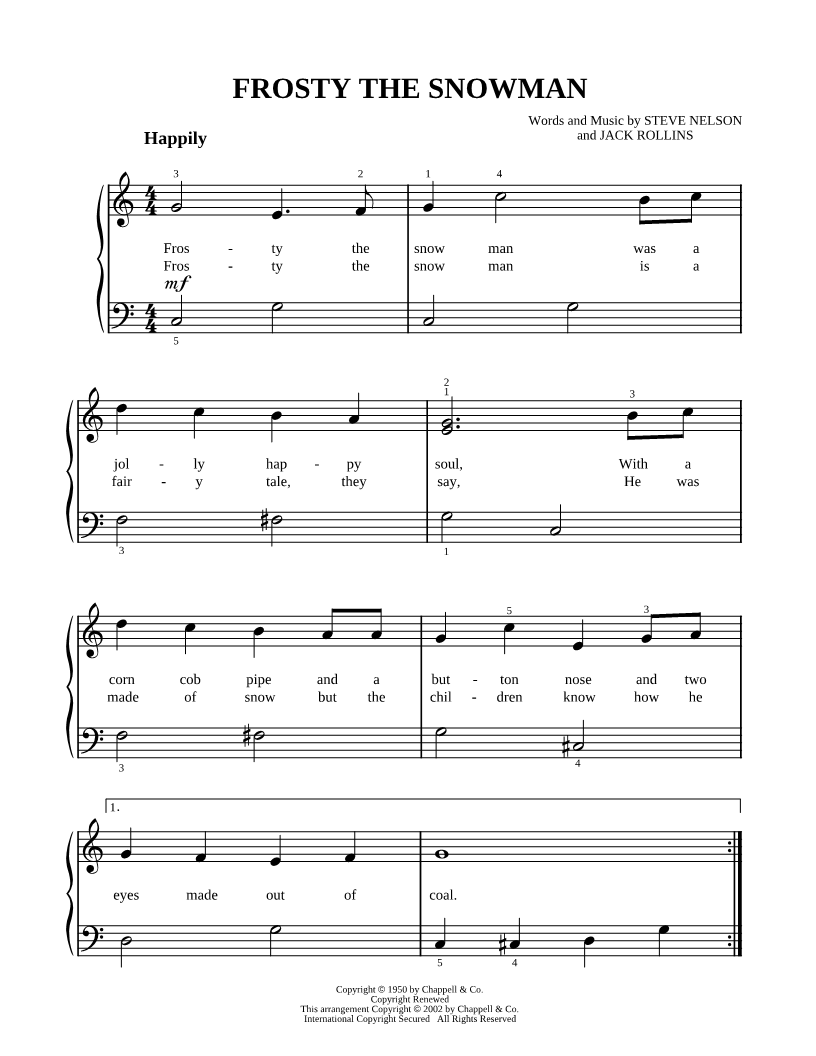 1. Frosty the Snowman (click here to preview and play this piece) Performers: Composers: Lyricists: Scored For:Piano/Vocal Instruments:Piano and Voice Number of pages:4 Click here to purchase this piece separately for $4.99 |