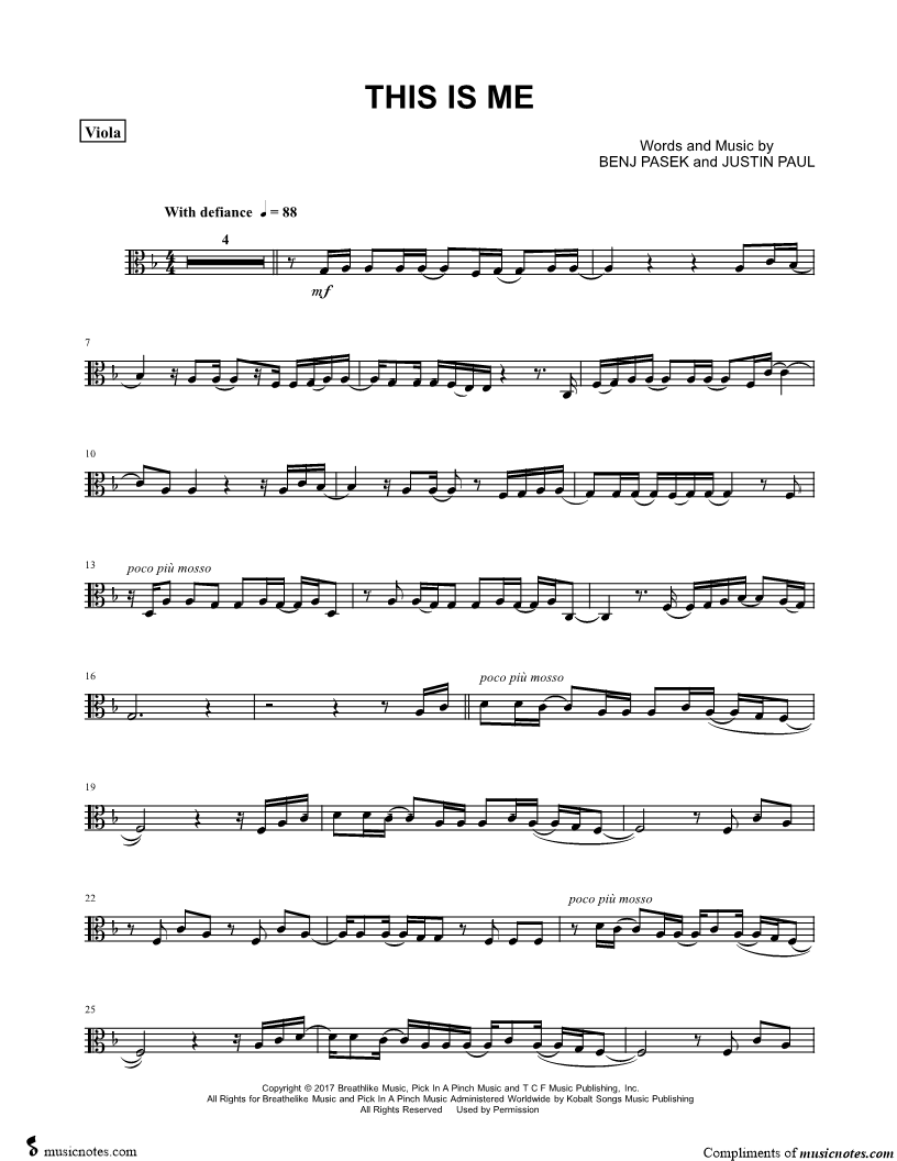 1. This Is Me - Viola (click here to preview and play this piece) Performer: Composers: Lyricists: Scored For:Instrumental Part and Instrumental Solo Instrument:Viola, range: C3-A4 Number of pages:3 Click here to purchase this piece separately for $4.99 |
