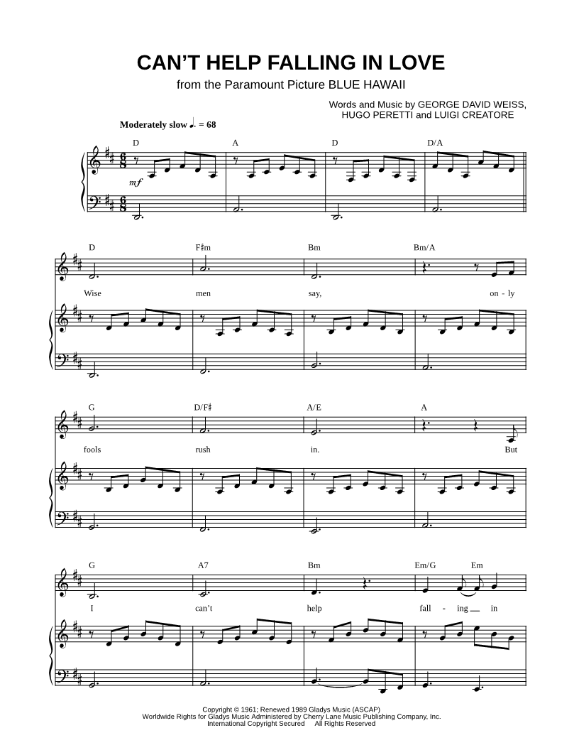 1. Can't Help Falling in Love (click here to preview and play this piece) Performer: Composers: Lyricists: Scored For:Piano/Vocal/Chords, Singer Pro and Transcription Instruments:Voice, range: A3-C#5 and Piano Number of pages:6 Click here to purchase this piece separately for $5.99 |