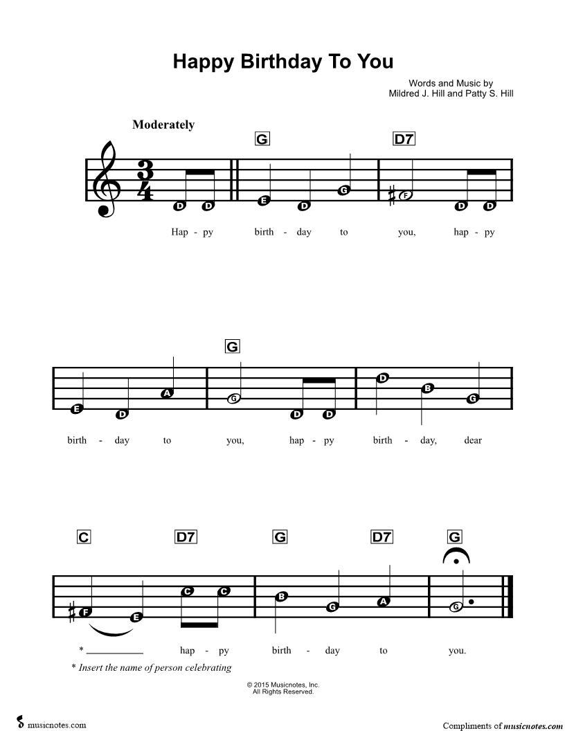 1. Happy Birthday to You! (click here to preview and play this piece) Composers: Lyricists: Scored For:Piano/Vocal/Chords Instruments:Voice, range: D4-D5, Treble Clef Instrument and Piano Number of pages:1 Click here to purchase this piece separately for $4.99 |