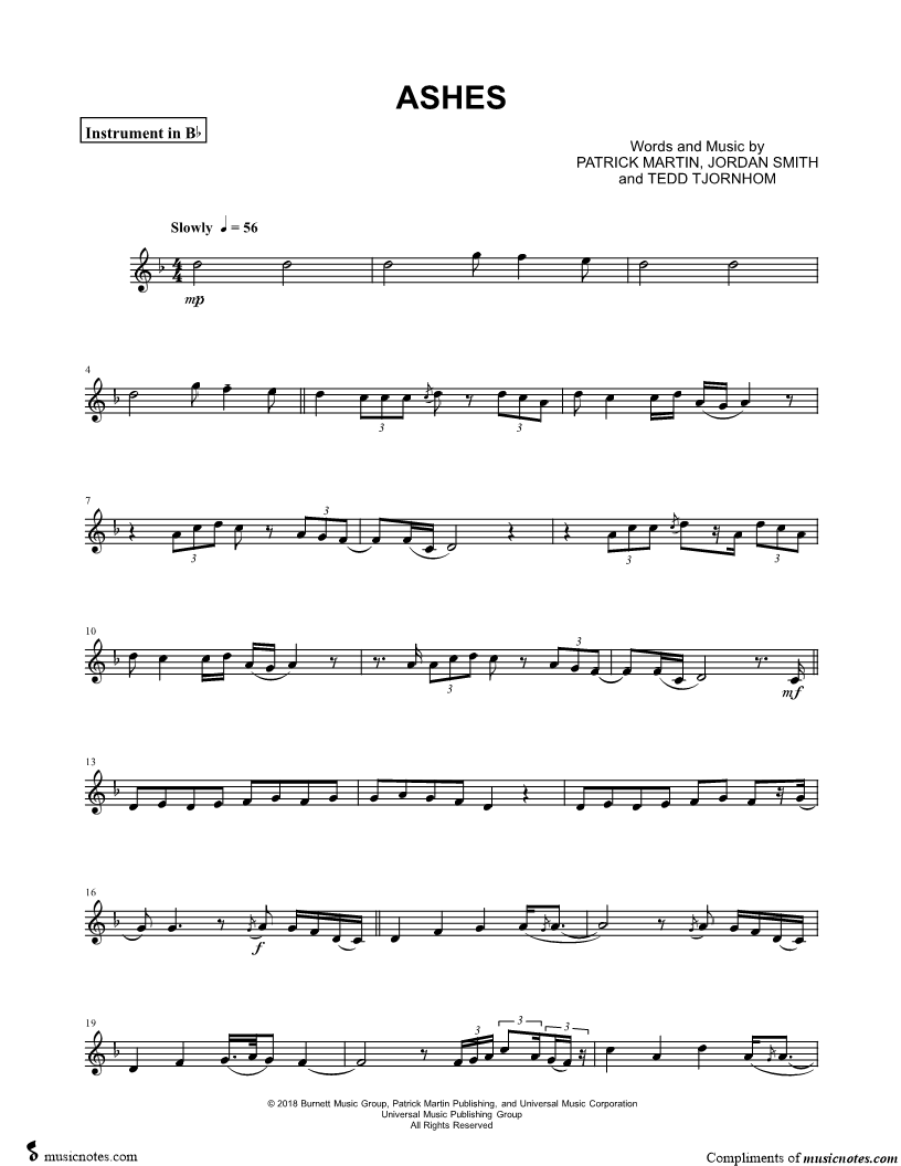 1. Ashes - Bb Instrument (click here to preview and play this piece) Performer: Composers: Lyricists: Scored For:Instrumental Solo and Instrumental Part Instruments:Bb Instrument, range: Bb3-G5, Trumpet, Soprano Saxophone, Tenor Saxophone and Clarinet Number of pages:2 Click here to purchase this piece separately for $4.99 |