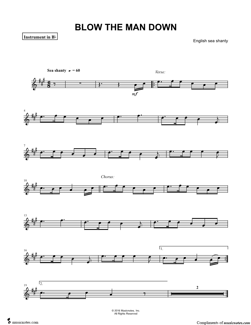 1. Blow the Man Down - Bb Instrument (click here to preview and play this piece) Composer: Scored For:Instrumental Solo and Instrumental Part Instruments:Bb Instrument, range: E4-F#5, Trumpet, Soprano Saxophone, Tenor Saxophone and Clarinet Number of pages:1 Click here to purchase this piece separately for $4.99 |