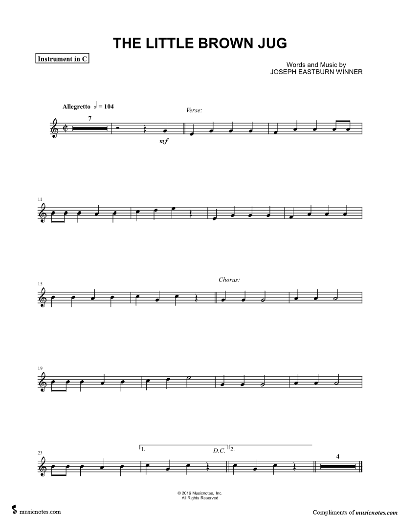 1. Little Brown Jug - C Instrument (click here to preview and play this piece) Composer: Lyricist: Scored For:Instrumental Part and Instrumental Solo Instruments:C Instrument, range: E4-E5, Violin, Oboe, Flute and Recorder Number of pages:1 Click here to purchase this piece separately for $4.99 |