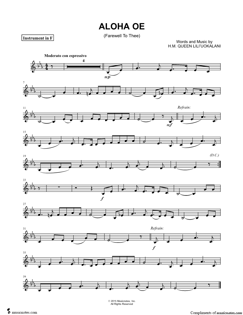 1. Aloha Oe - F Instrument (click here to preview and play this piece) Composer: Lyricist: Scored For:Instrumental Part and Instrumental Solo Instrument:F Instrument, range: Bb3-Ab4 Number of pages:1 Click here to purchase this piece separately for $4.99 |