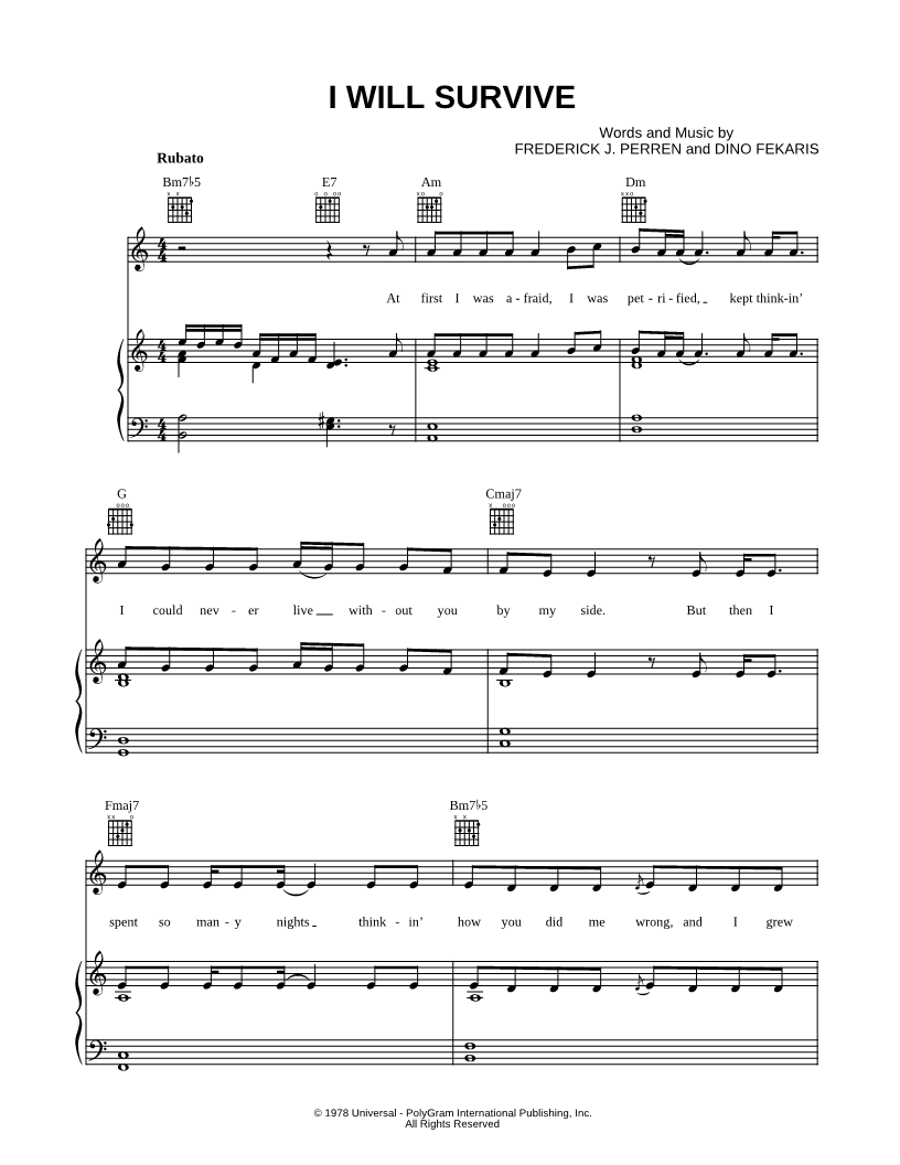 1. I Will Survive (click here to preview and play this piece) Performer: Composers: Lyricists: Scored For:Piano/Vocal/Guitar Instruments:Voice, range: D4-C5, Guitar and Piano Number of pages:5 Click here to purchase this piece separately for $5.99 |