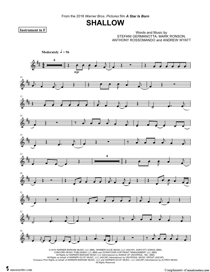 1. Shallow - F Instrument (click here to preview and play this piece) Performers: Composers: Lyricists: Scored For:Instrumental Solo and Instrumental Part Instruments:F Instrument, range: F#3-B4 and French Horn Number of pages:2 Click here to purchase this piece separately for $4.99 |