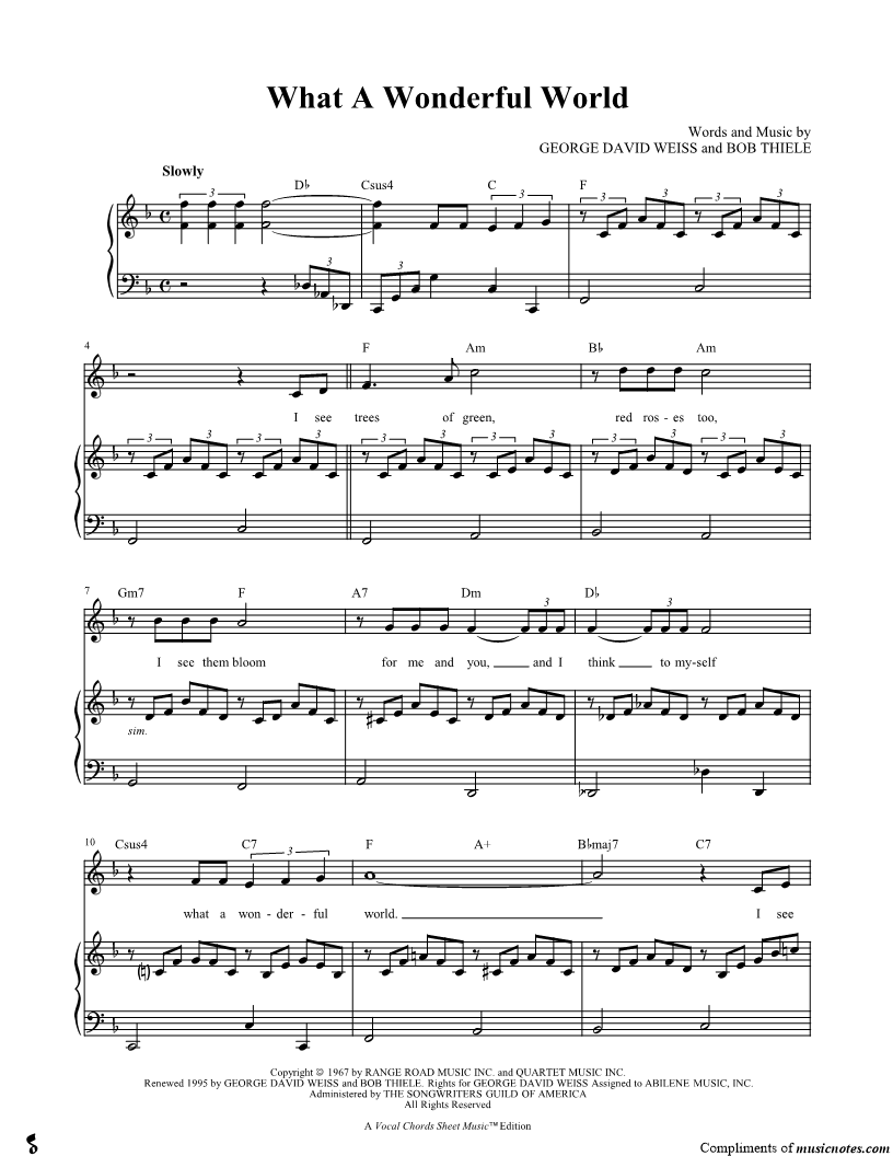 1. What a Wonderful World (click here to preview and play this piece) Performer: Composers: Lyricists: Scored For:Piano/Vocal/Chords and Singer Pro Instruments:Voice, range: C4-D5 and Piano Number of pages:4 Click here to purchase this piece separately for $5.99 |