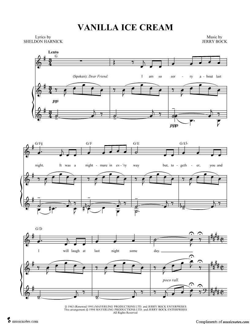 1. Vanilla Ice Cream (click here to preview and play this piece) Performer: Composer: Lyricist: Scored For:Piano/Vocal/Chords and Singer Pro Instruments:Voice, range: D4-B5 and Piano Number of pages:7 Click here to purchase this piece separately for $5.99 |
