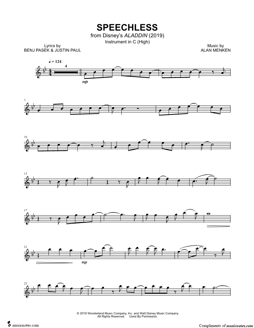 1. Speechless - C Instrument (High) (click here to preview and play this piece) Performer: Composer: Lyricists: Scored For:Instrumental Part and Instrumental Solo Instruments:C Instrument, range: G4-F6, Violin, Flute, Oboe and Recorder Number of pages:3 Click here to purchase this piece separately for $4.99 |