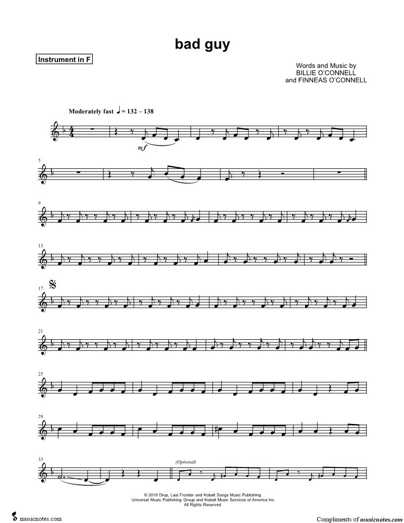 1. bad guy - F Instrument (click here to preview and play this piece) Performer: Composers: Lyricists: Scored For:Instrumental Solo and Instrumental Part Instruments:F Instrument, range: C4-C#5 and French Horn Number of pages:2 Click here to purchase this piece separately for $4.99 |