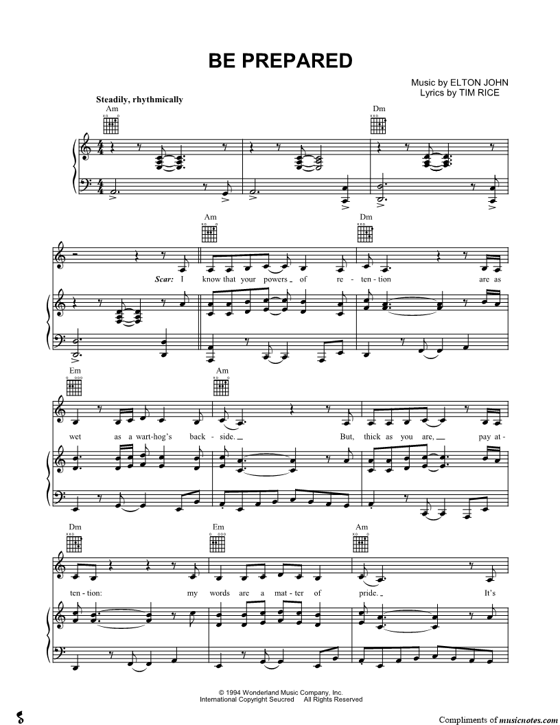 1. Be Prepared (click here to preview and play this piece) Performers: Composer: Lyricist: Scored For:Piano/Vocal/Guitar Instruments:Voice, range: A3-B4, Piano and Guitar Number of pages:8 Click here to purchase this piece separately for $5.99 |