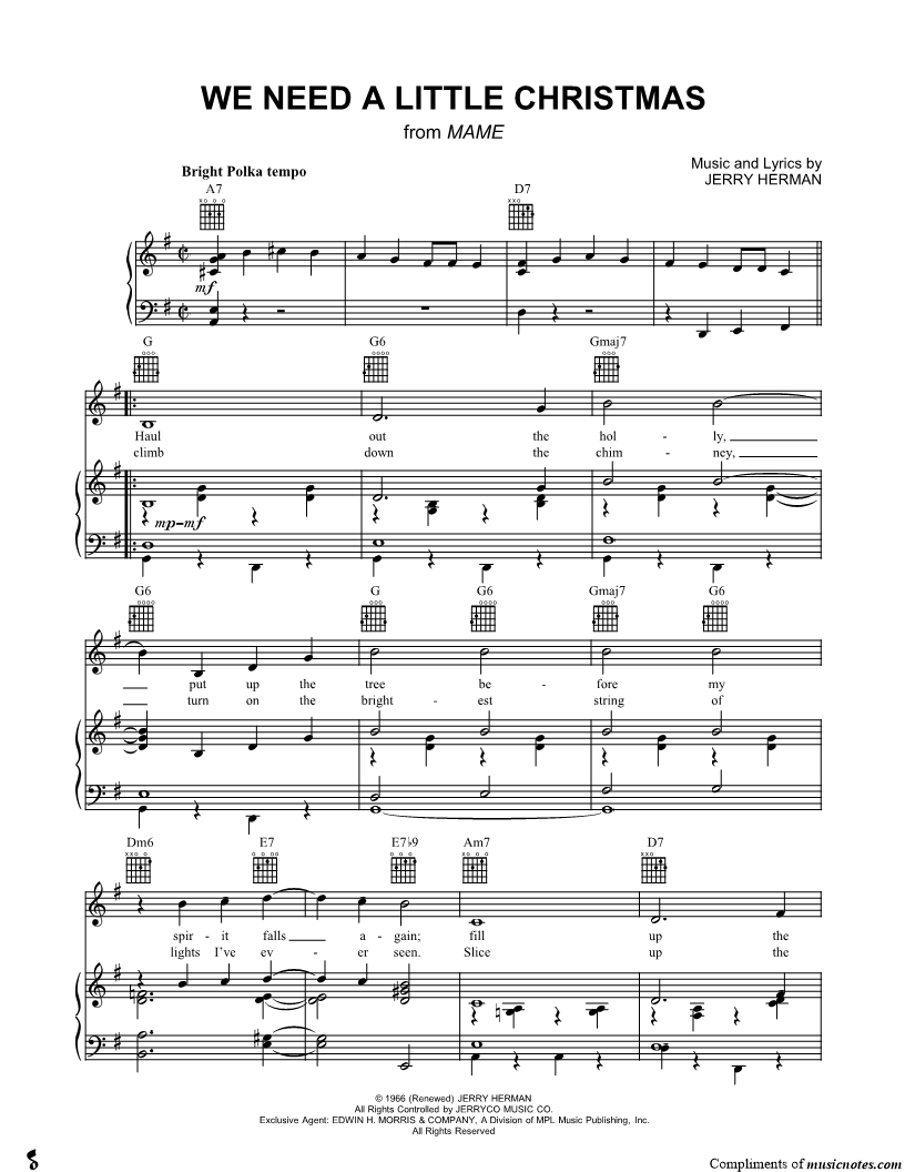 1. We Need a Little Christmas (click here to preview and play this piece) Performer: Composer: Lyricist: Scored For:Piano/Vocal/Guitar Instruments:Voice, range: B3-G5, Piano and Guitar Number of pages:3 Click here to purchase this piece separately for $5.99 |