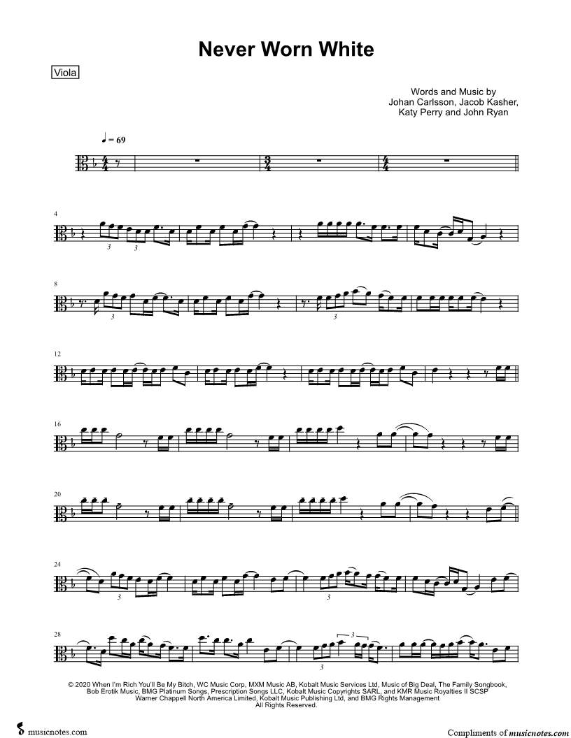 1. Never Worn White - Viola (click here to preview and play this piece) Performer: Composers: Lyricists: Scored For:Instrumental Solo and Instrumental Part Instrument:Viola, range: G3-F5 Number of pages:2 Click here to purchase this piece separately for $4.99 |