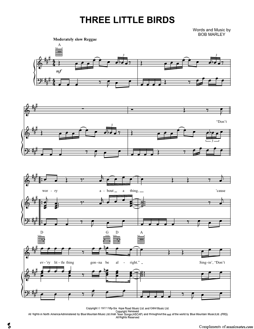 1. Three Little Birds (click here to preview and play this piece) Performers: Composer: Lyricist: Scored For:Piano/Vocal/Guitar Instruments:Voice, range: A4-A5, Piano and Guitar Number of pages:3 Click here to purchase this piece separately for $5.99 |