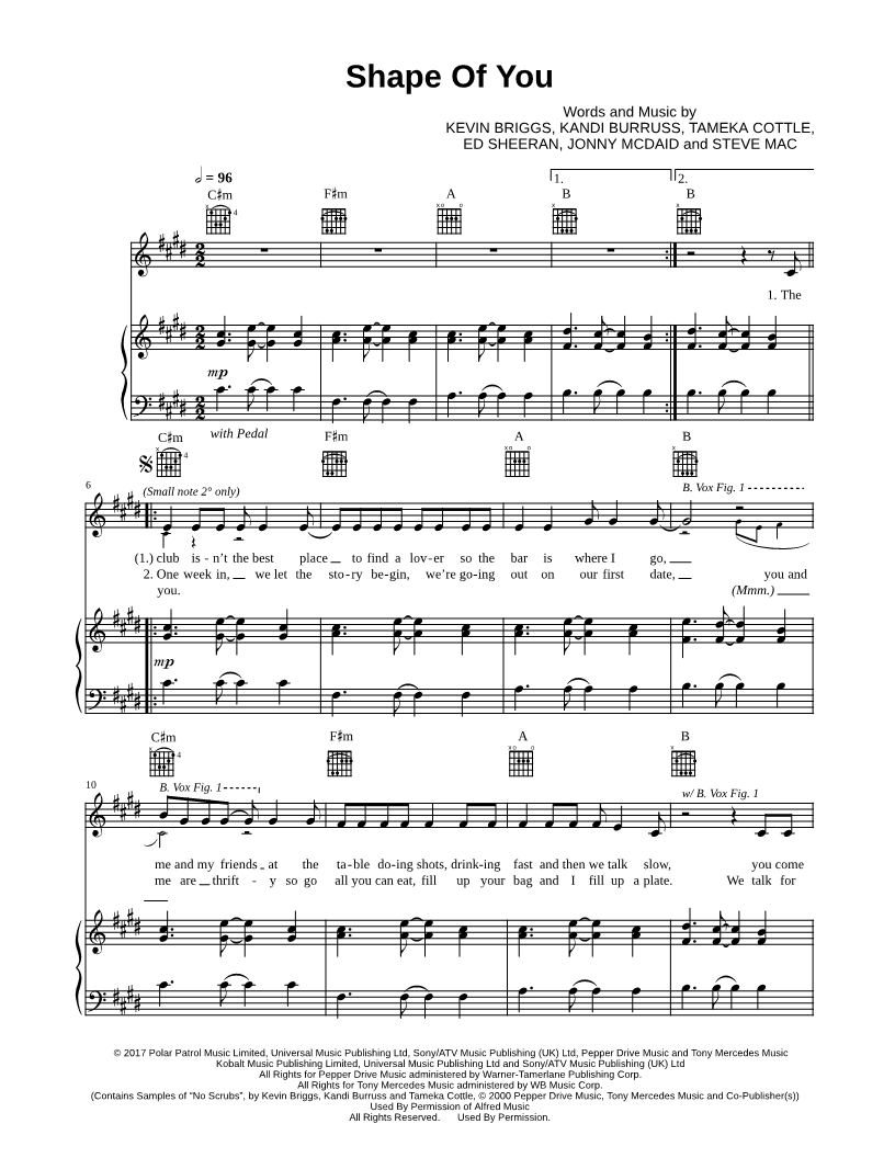 1. Shape of You (click here to preview and play this piece) Performer: Composers: Lyricists: Scored For:Piano/Vocal/Guitar and Singer Pro Instruments:Voice, range: G#3-G#5, Piano and Guitar Number of pages:6 Click here to purchase this piece separately for $5.99 |