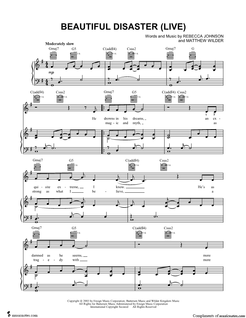 1. Beautiful Disaster (Live) (click here to preview and play this piece) Performer: Composers: Lyricists: Scored For:Piano/Vocal/Guitar Instruments:Piano, Guitar and Voice Number of pages:6 Click here to purchase this piece separately for $5.99 |