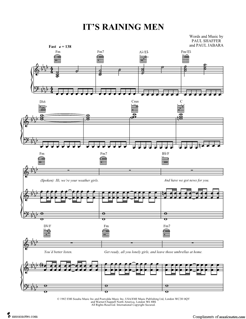 1. It's Raining Men (click here to preview and play this piece) Performer: Composers: Lyricists: Scored For:Piano/Vocal/Guitar Instruments:Voice, range: F3-F5, Guitar and Piano Number of pages:8 Click here to purchase this piece separately for $5.99 |