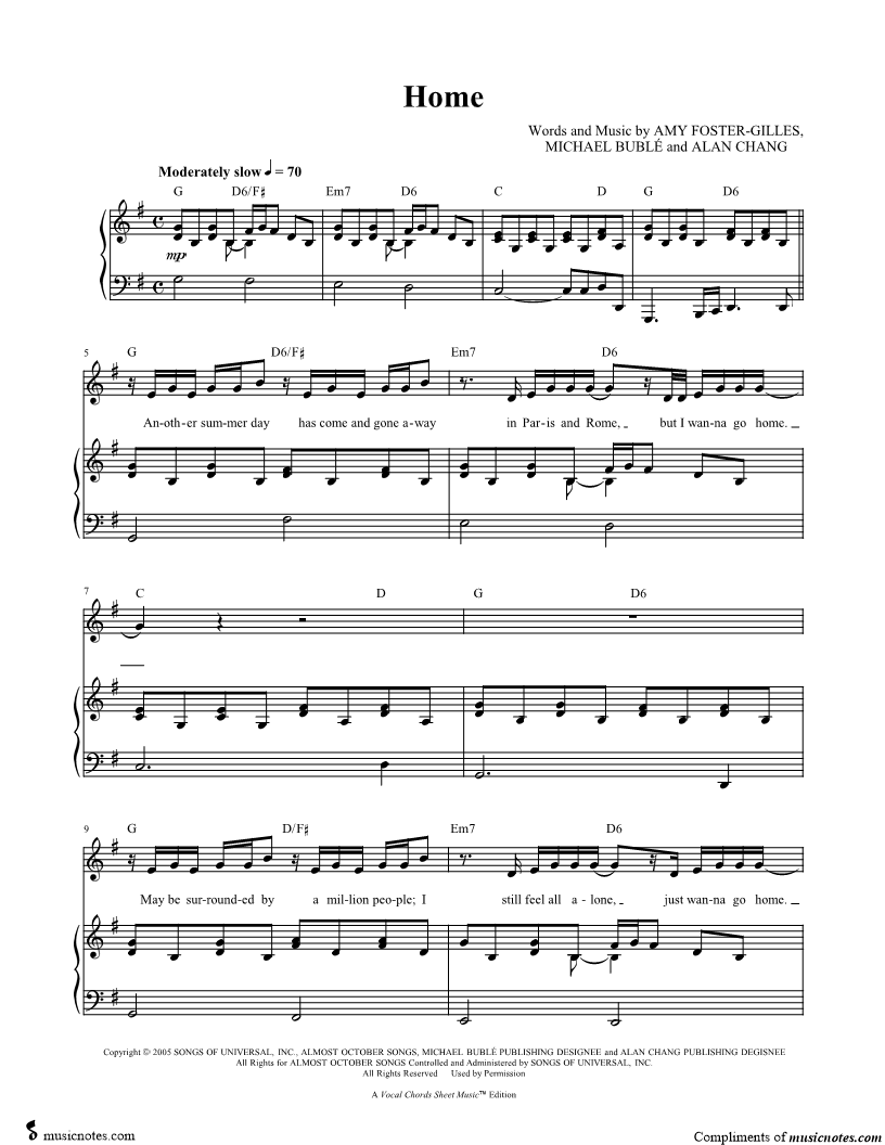 12. You're My Home (click here to preview and play this piece) Performer: Composer: Lyricist: Scored For:Piano/Vocal/Guitar Instruments:Guitar, Piano and Voice, range: C4-D5 Number of pages:4 Click here to purchase this piece separately for $5.99 |