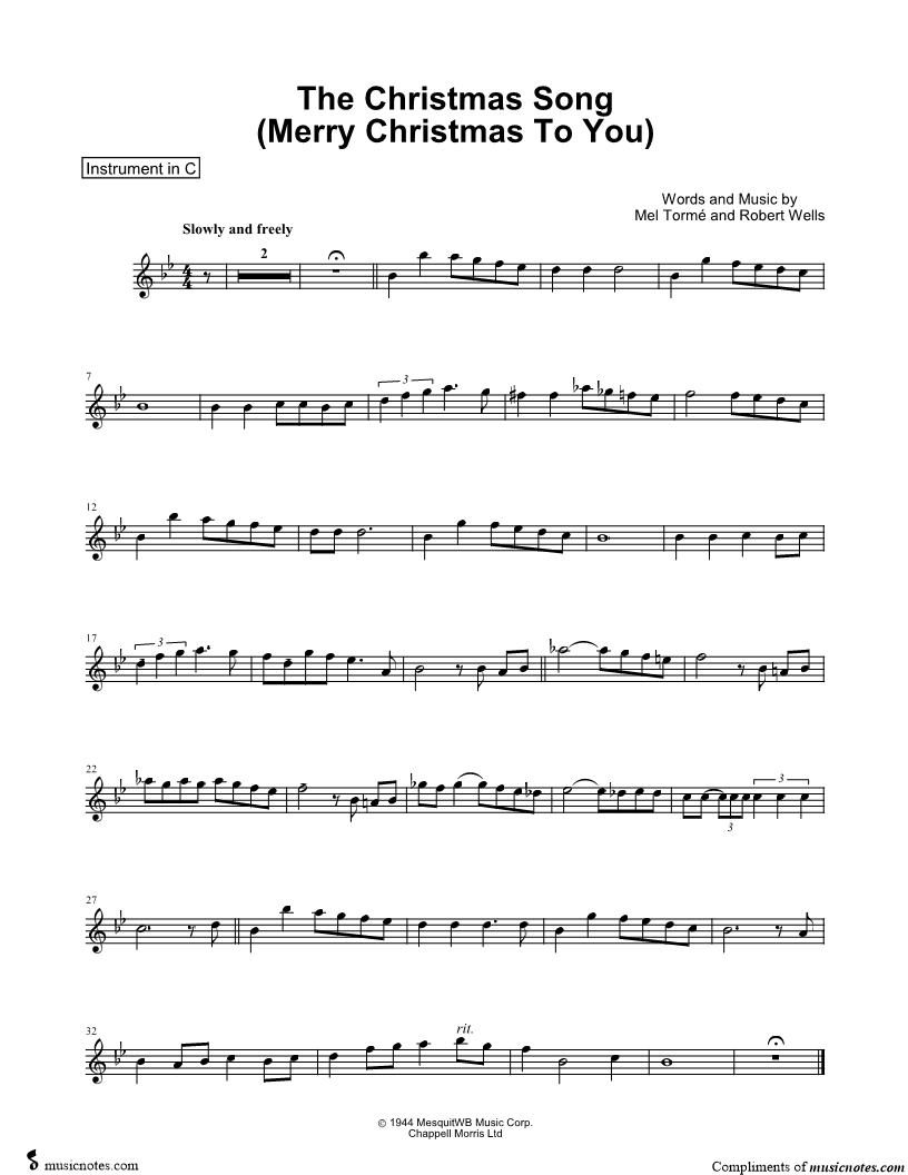 1. The Christmas Song (Chestnuts Roasting on an Open Fire) - C Instrument (click here to preview and play this piece) Performer: Composers: Lyricists: Scored For:Instrumental Solo and Instrumental Part Instruments:C Instrument, range: A4-Bb5, Flute, Oboe, Violin and Recorder Number of pages:1 Click here to purchase this piece separately for $4.99 |
