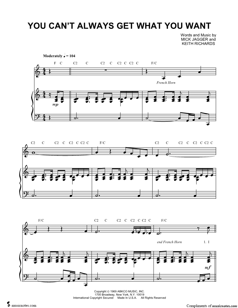 1. You Can't Always Get What You Want (click here to preview and play this piece) Performer: Composers: Lyricists: Scored For:Piano/Vocal/Chords Instruments:Piano and Voice, range: A3-G5 Number of pages:7 Click here to purchase this piece separately for $5.99 |
