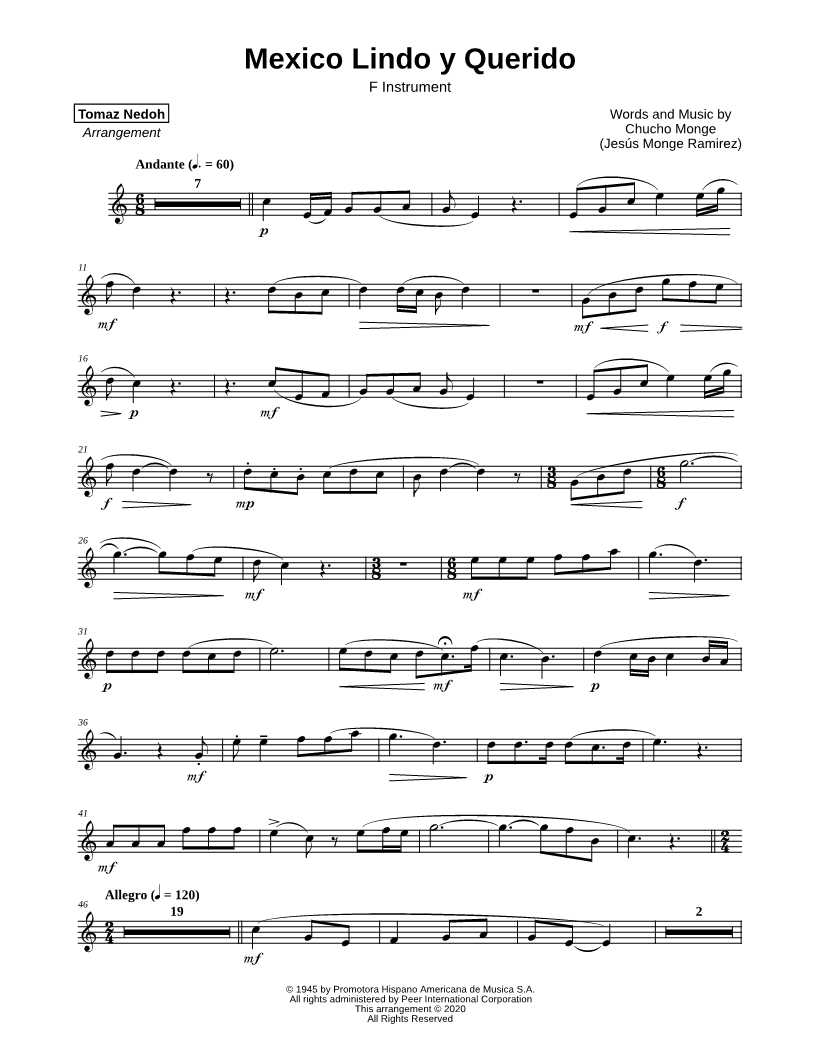 1. México Lindo y Querido - F Instrument (click here to preview and play this piece) Performer: Composer: Lyricist: Scored For:Instrumental Solo and Instrumental Part Instruments:F Instrument, range: E4-C6 and French Horn Number of pages:2 Click here to purchase this piece separately for $2.99 |