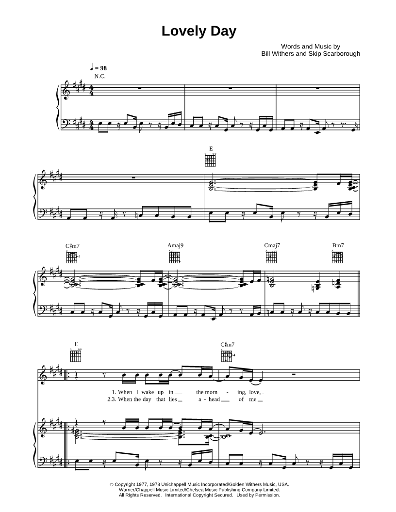 1. Lovely Day (click here to preview and play this piece) Performer: Composers: Lyricists: Scored For:Piano/Vocal/Guitar Instruments:Voice, range: B3-E5, Piano and Guitar Number of pages:5 Click here to purchase this piece separately for $5.99 |