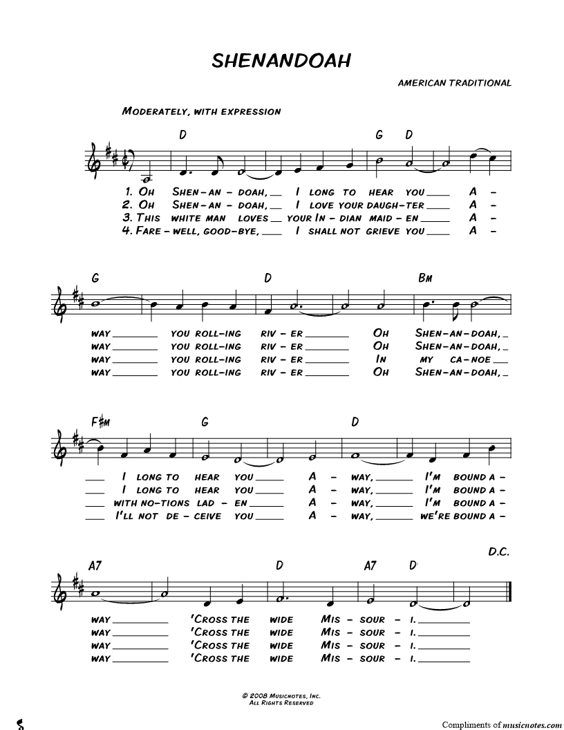 1. Shenandoah (click here to preview and play this piece) Composer: Lyricist: Scored For:Lyrics/Melody/Chords and Leadsheet Instruments:Voice, range: A3-D5 and C Instrument Number of pages:1 Click here to purchase this piece separately for $3.99 |
