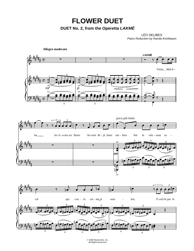 1. Flower Duet (click here to preview and play this piece) Composer: Lyricist: Scored For:Piano/Vocal, Singer Pro and Piano Reduction Instruments:Voice 1, range: B3-B5, Piano and Voice 2, range: B3-B5 Number of pages:11 Click here to purchase this piece separately for $5.99 |