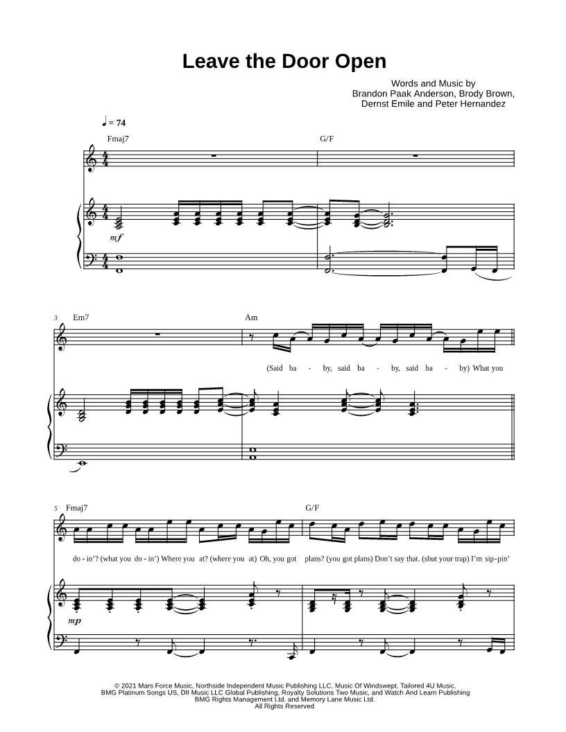 1. Leave the Door Open (click here to preview and play this piece) Performers: Composers: Lyricists: Scored For:Piano/Vocal/Chords and Singer Pro Instruments:Voice, range: F4-D6, Piano and Backup Vocals Number of pages:9 Click here to purchase this piece separately for $5.99 |