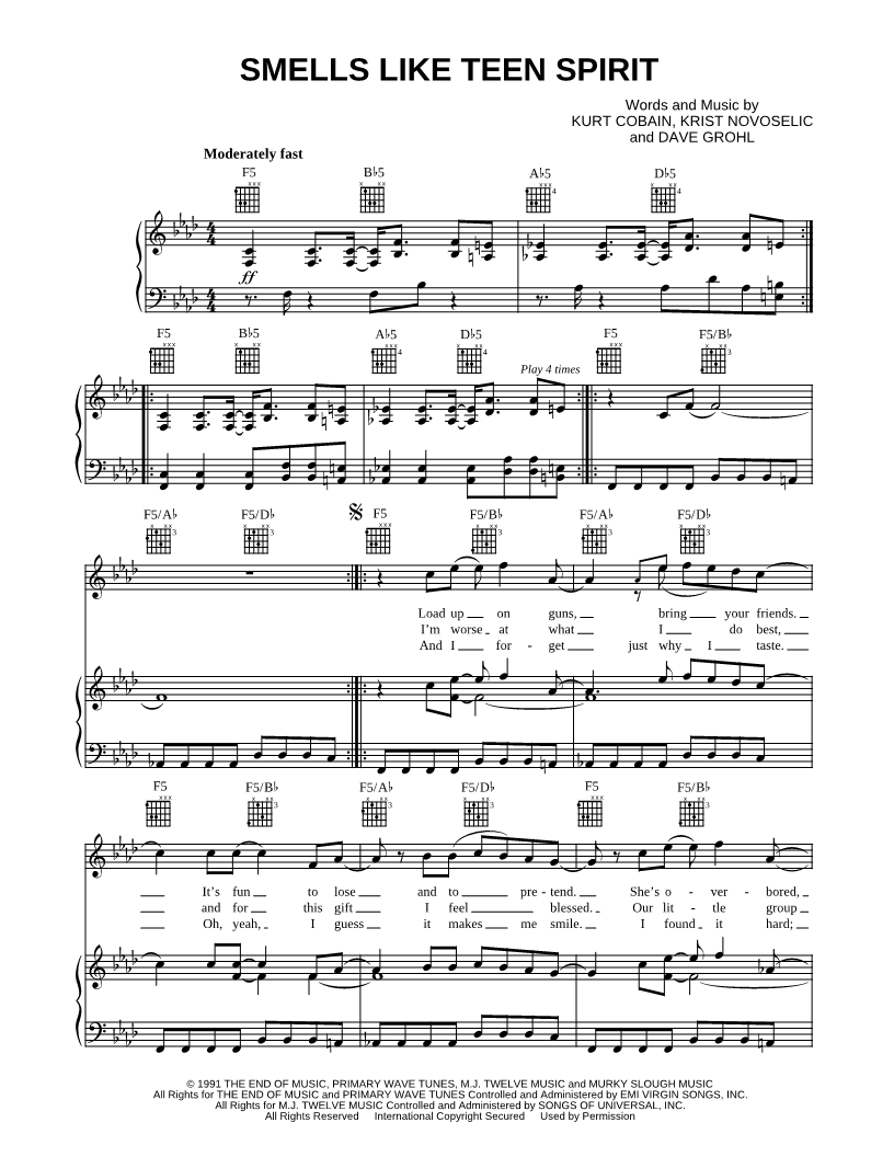 1. Smells Like Teen Spirit (click here to preview and play this piece) Performer: Composers: Lyricists: Scored For:Piano/Vocal/Guitar Instruments:Voice, range: F4-Bb5, Piano and Guitar Number of pages:5 Click here to purchase this piece separately for $5.99 |