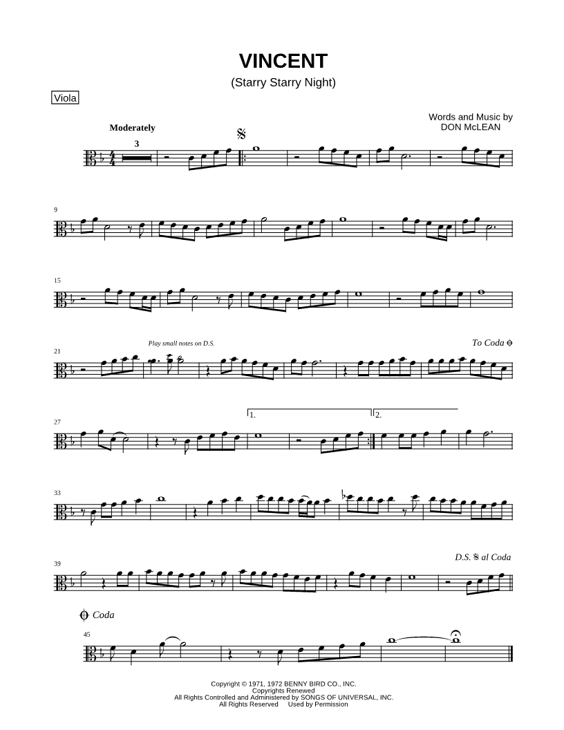 1. Vincent (Starry Starry Night) - Viola (click here to preview and play this piece) Performer: Composer: Lyricist: Scored For:Instrumental Solo and Instrumental Part Instrument:Viola Number of pages:1 Click here to purchase this piece separately for $4.99 |