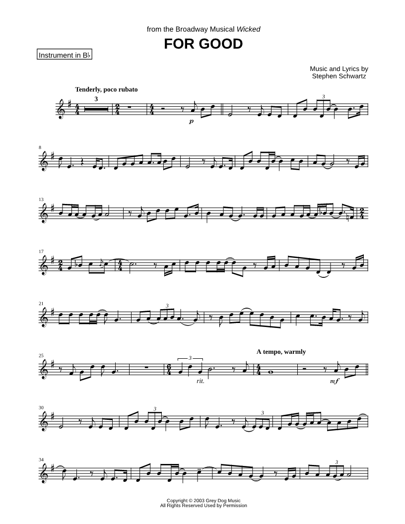 1. For Good - Bb Instrument (click here to preview and play this piece) Composer: Lyricist: Scored For:Instrumental Solo and Instrumental Part Instruments:Bb Instrument, range: D4-G5, Trumpet, Soprano Saxophone, Tenor Saxophone and Clarinet Number of pages:2 Click here to purchase this piece separately for $4.99 |
