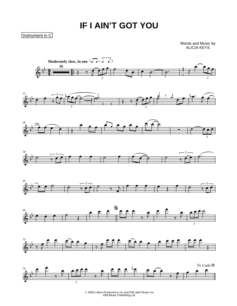 1. If I Ain't Got You - C Instrument (click here to preview and play this piece) Performer: Composer: Lyricist: Scored For:Instrumental Solo and Instrumental Part Instruments:C Instrument, range: F4-F6, Flute, Violin, Oboe and Recorder Number of pages:2 Click here to purchase this piece separately for $4.99 |