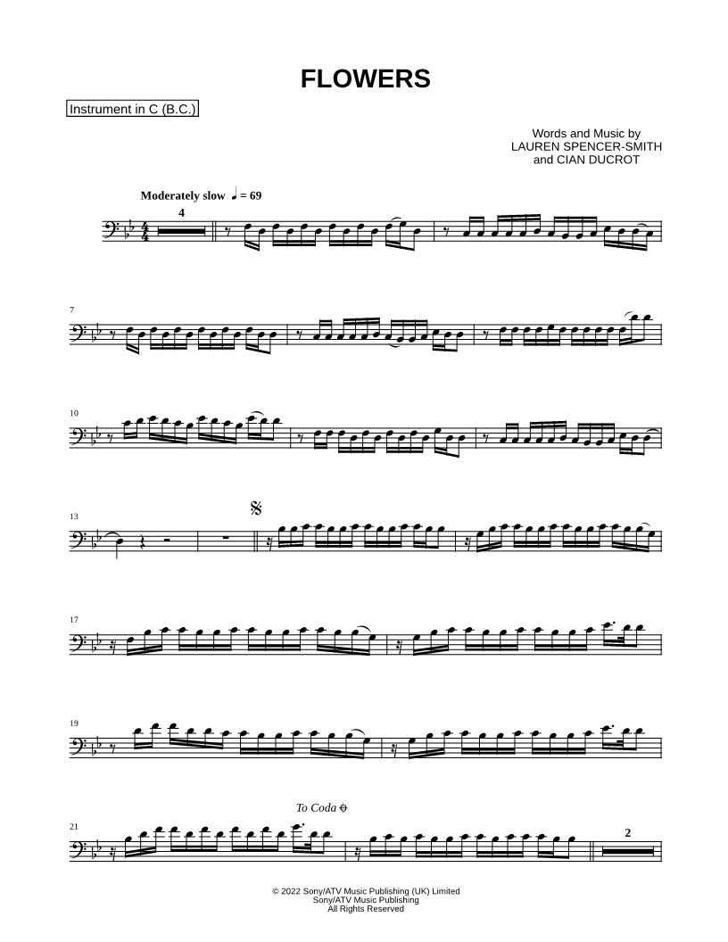 1. Flowers - Bass Clef Instrument (click here to preview and play this piece) Performer: Composers: Lyricists: Scored For:Instrumental Solo and Instrumental Part Instruments:Bass Clef Instrument, Cello, Double Bass, Trombone, Bassoon and Baritone Horn Number of pages:2 Click here to purchase this piece separately for $4.99 |