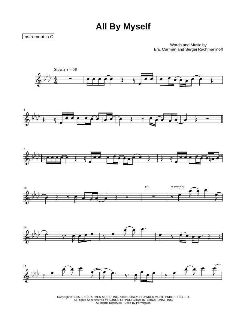 1. All By Myself - C Instrument (click here to preview and play this piece) Performer: Composers: Lyricist: Scored For:Instrumental Solo and Instrumental Part Instruments:C Instrument, range: Eb4-E6, Flute, Oboe, Violin and Recorder Number of pages:2 Click here to purchase this piece separately for $4.99 |